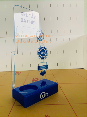 Kệ Trưng bày mĩ phẩm mica được làm từ mica trong suốt và mica màu xanh nokia dày 2mm, gia công cắt lzer và uốn nhiệt tạo hình sản phẩm. kệ mica được thiết kế nhỏ gọn tối ưu diện tích trưng bày. Phần lưng của kệ được in UV tên và các thông số của sản phẩm giúp người mua dễ dàng nắm được thông tin sản phẩm