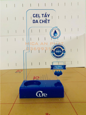 Kệ Trưng bày mĩ phẩm Gel tẩy da chết được sản xuất từ chất liệu mica cao cấp, cắt lazer mịn, in UV trực tiếp lên mica làm nổi bật sự sang trọng, cao cấp của sản phẩm mỹ phẩm được trưng bày